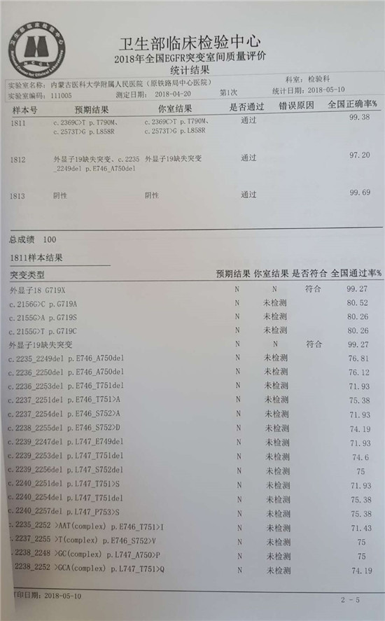 内蒙古自治区肿瘤医院检验科PCR实验室自2015年10月成立并通过认证以来,一直致力于肿瘤的分子检验,指导临床靶向用药,为患者的个体化治疗提供依据,使其从中获益。其中,主要针对肺癌患者的EGFR基因突变检测和针对结直肠癌患者的KRAS基因突变检测在全国卫生部临床检验质量控制中均获满分成绩。